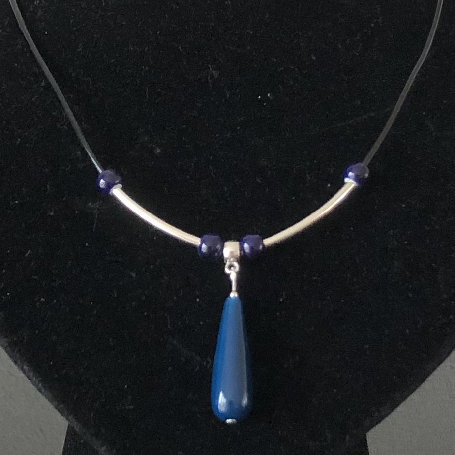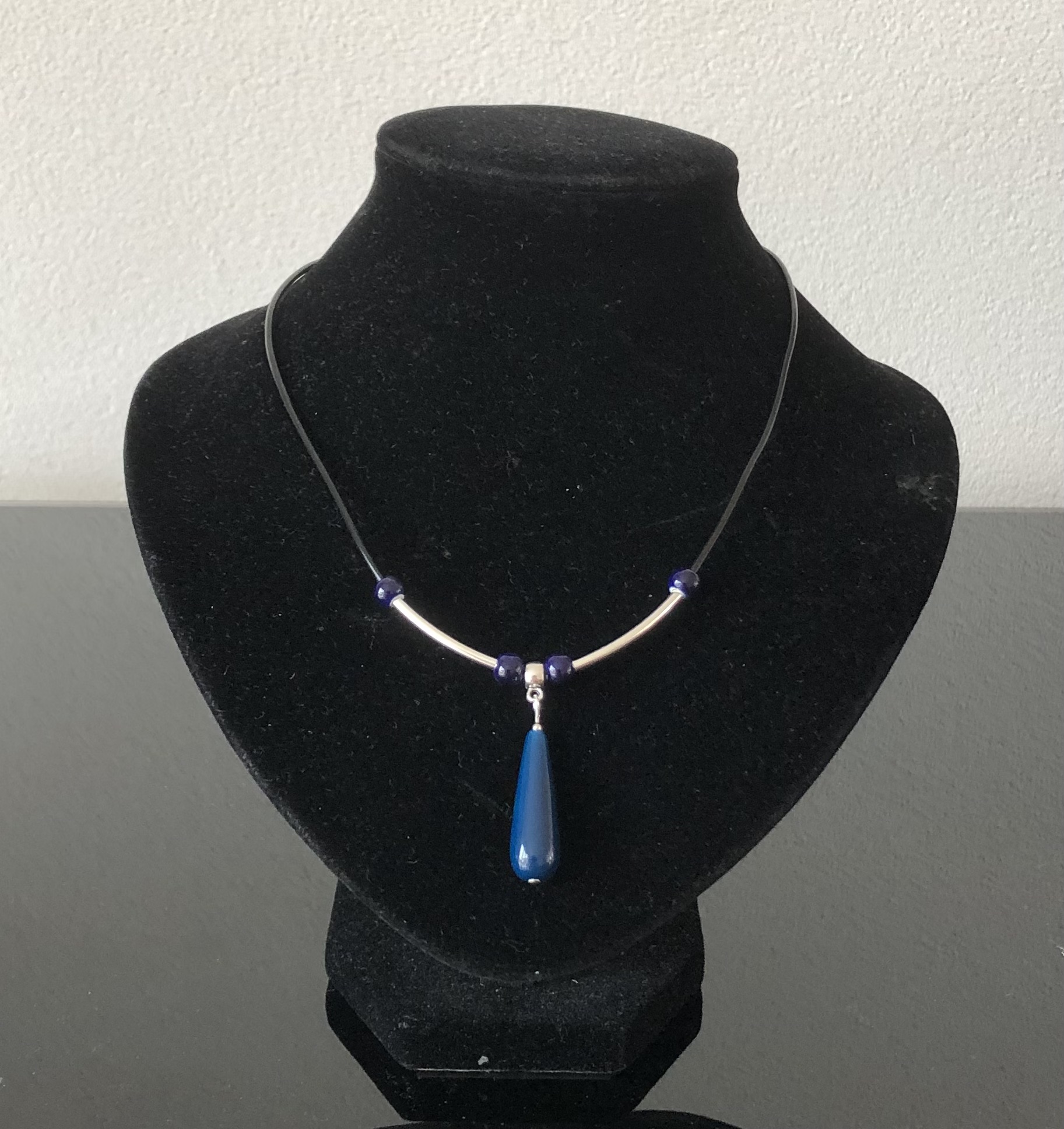 Hanger van blauwe agaat met kralen van keramiek. Lengte van de druppelvormige agaatkraal is 30 mm.