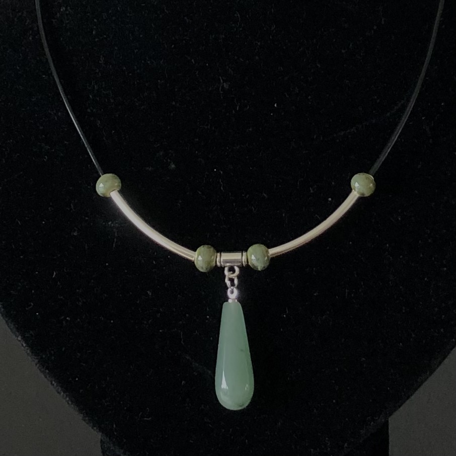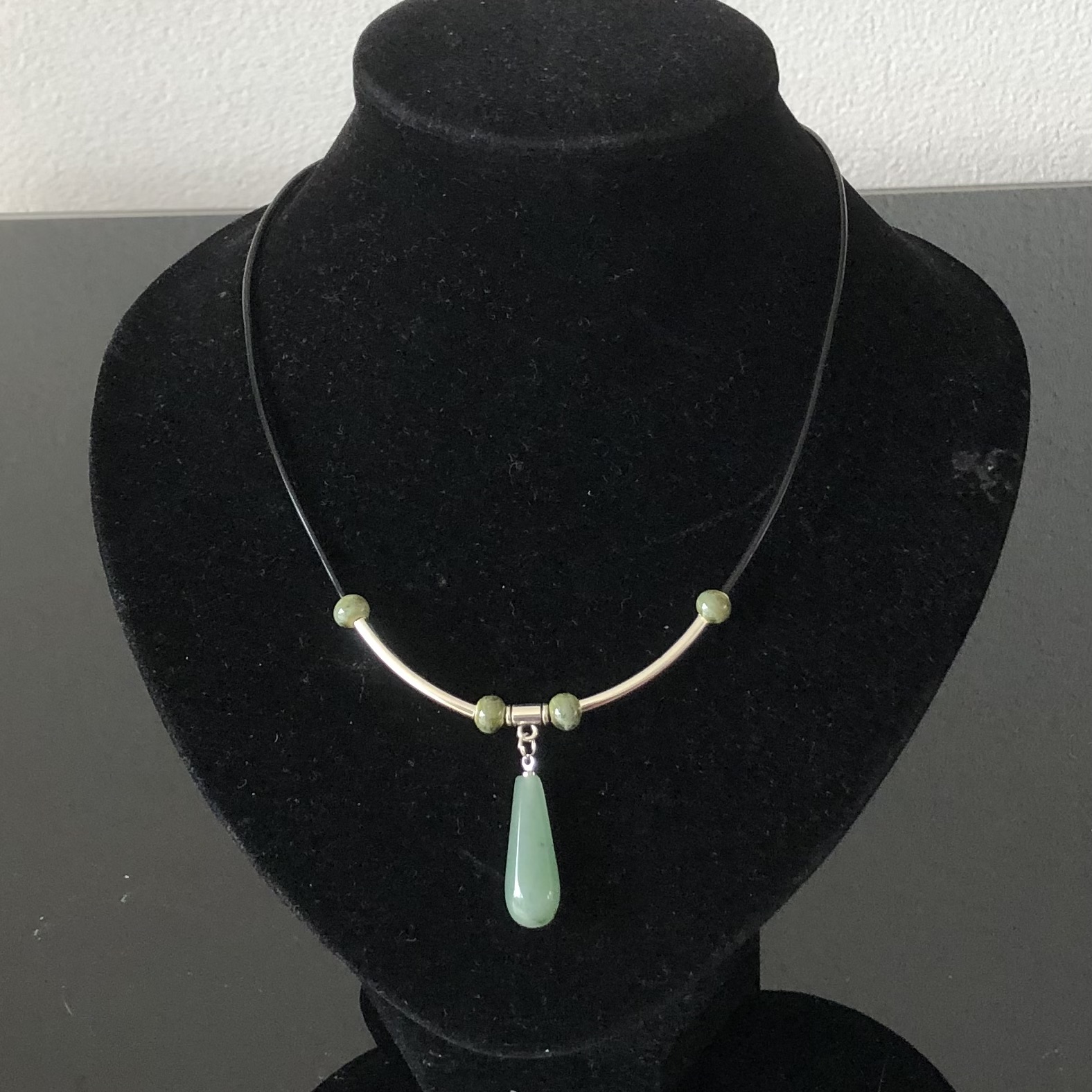 Hanger van groene aventurijn met kralen van keramiek. Lengte van de druppelvormige aventurijnkraal is 30 mm.