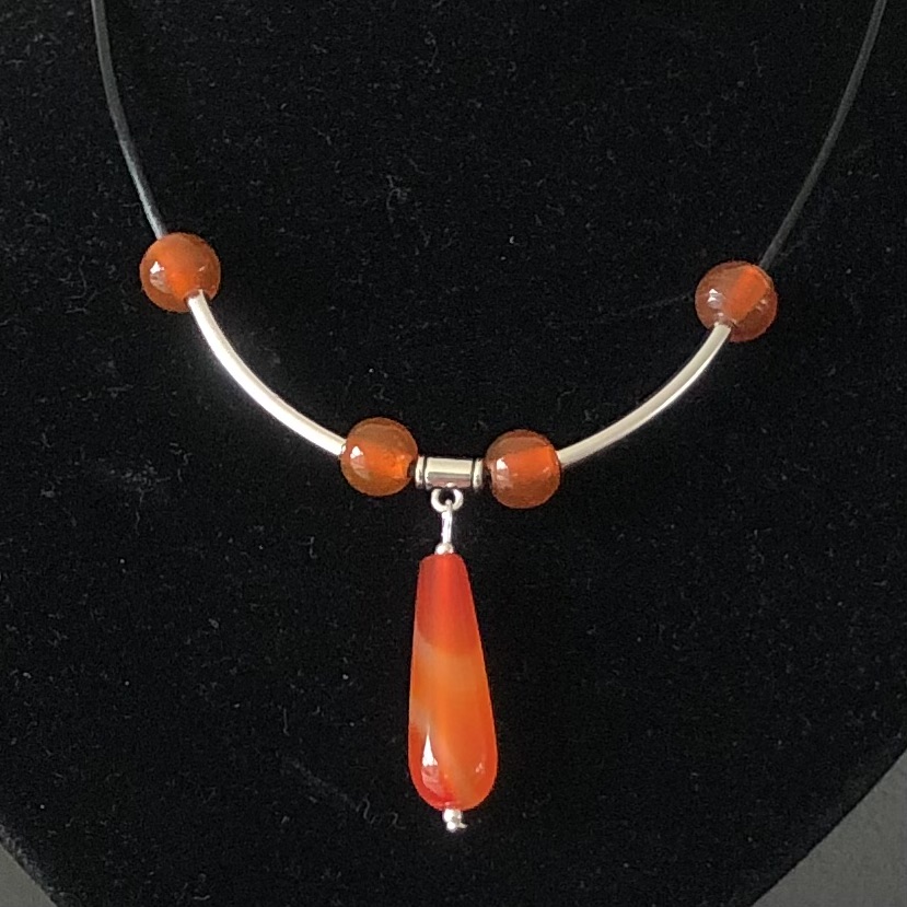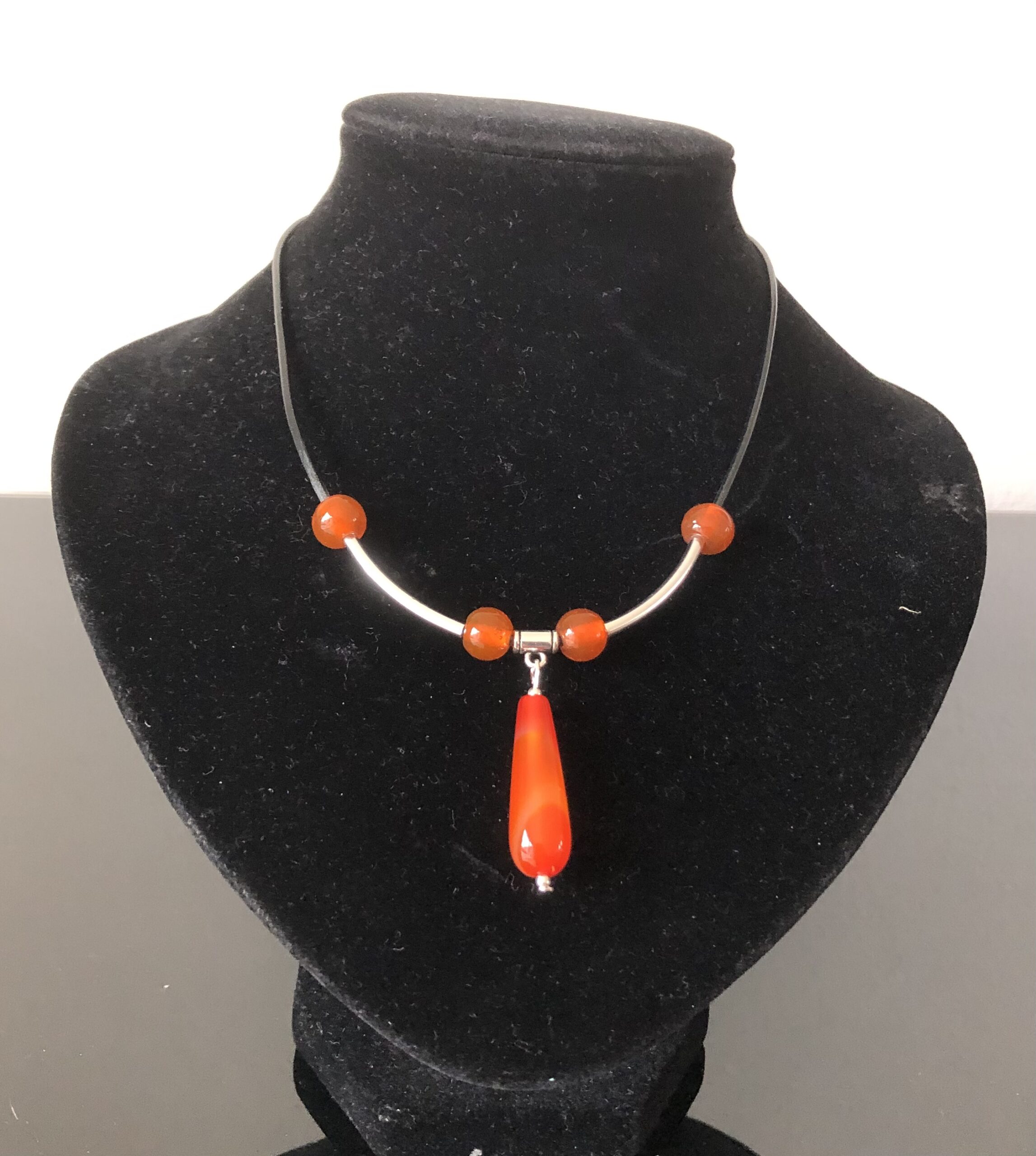 Hanger van oranje agaat met kralen van glas. Lengte van de druppelvormige agaatkraal is 30 mm.